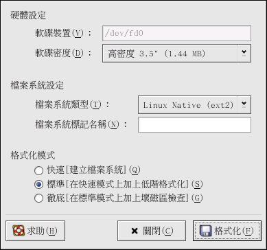 想要特定地在 Red Hat Linux 上使用磁碟片,您必須格式化磁碟片為 ext2 檔案系統。 ext2 是 Red Hat Linux 所支援的檔案系統之一,而且也是用來格式化磁碟片的預設方式。