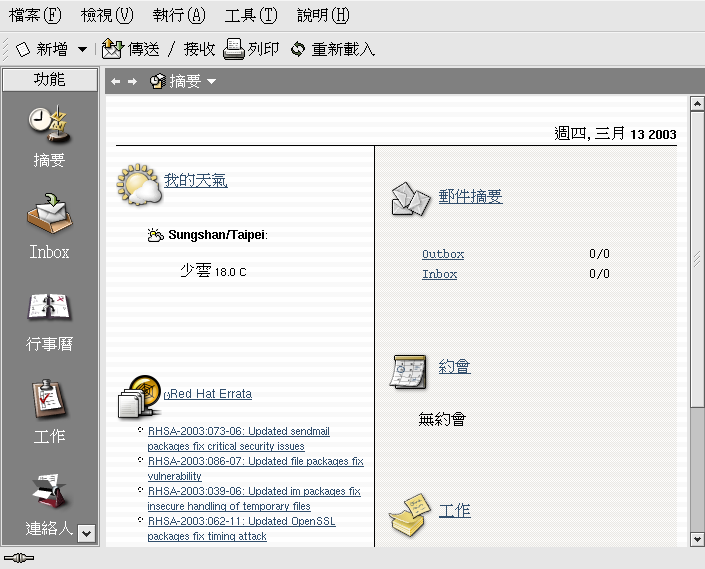 而 Evolution 的功能不只是用來閱讀與傳送電子郵件,這個章節只討論它的電子郵件功能。 假如您想知道更多關於使用 Evolution 一些其他的特色,像是行事曆與群組會議,您可以點選工具列上的 『說明』,並選取您想要的選項。