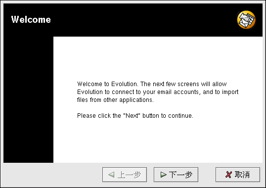 當您第一次啟動 Evolution,您將會看到歡迎畫面 (圖形 7-1),在此您可以設定您的電子郵件連線。 請遵照螢幕上的指示,並在所提供的文字欄位中填入您從您的 ISP 或系統管理員取得的資訊。 完成後,請點選 完成,您將會看如 圖形 7-2 所示的主要畫面。