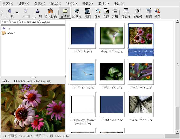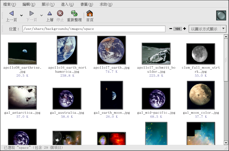 Nautilus 是用於桌面環境的一種多用途的檔案管理員與瀏覽器。 Nautilus 有許多超越簡單的影像檢視功能; 然而在這個地方,我們將它使用來做基本的影像瀏覽。 如需要更多關於 Nautilus 的資訊,請看 第2章 。