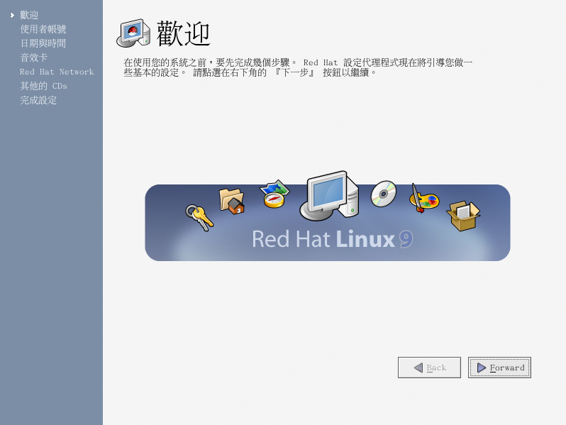 當您第一次啟動您的 Red Hat Linux 機器,您將會看到 設定代理程式,這個工具將會引導您做好 Red Hat Linux 的組態設定。 使用這個工具,您可以設定系統的日期與時間、新增系統的使用者、安裝軟體,以及向 Red Hat Network 註冊您的機器等等。 設定代理程式 讓您可以在第一次啟動時便設定好您的環境,如此您便可以馬上開始使用您的 Red Hat Linux 系統。