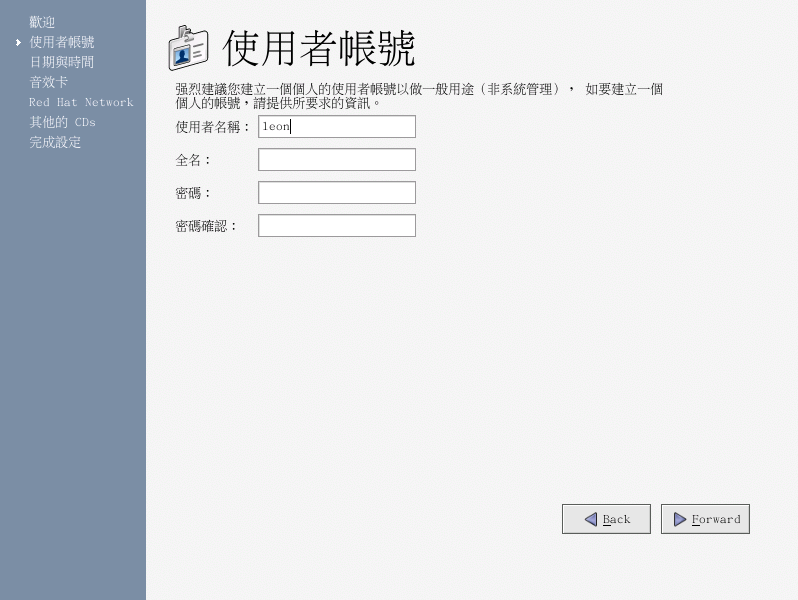 設定代理程式 會提示您建立一個日常使用的使用者帳號。 因為您也許會對您的系統造成損害或不小心地刪除一個檔案,所以不建議您以 root 帳號登入來做一般的電腦工作。 設定代理程式 會讓您輸入一個使用者名稱、一個帳號的全名(可選的)以及一個密碼(必須輸入兩次)。 這將會建立一個使用者帳號,您可以使用來登入您的 Red Hat Linux 系統,而且該帳號會擁有自己的家目錄以用來儲存檔案。
