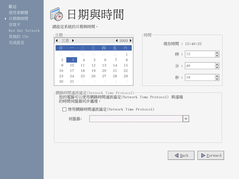 您也可以使您的日期與時間與一部 『網路時間伺服器』 自動同步化 — 該伺服器是用來透過網路連線傳送正確的時間與日期設定到您系統的一部機器。 請選取標示為 『啟用網路時間通訊協定』 的選取盒,並使用下拉式選單選取您想要使用的時間伺服器。 當您設定好日期與時間後,請點選 下一步 繼續。