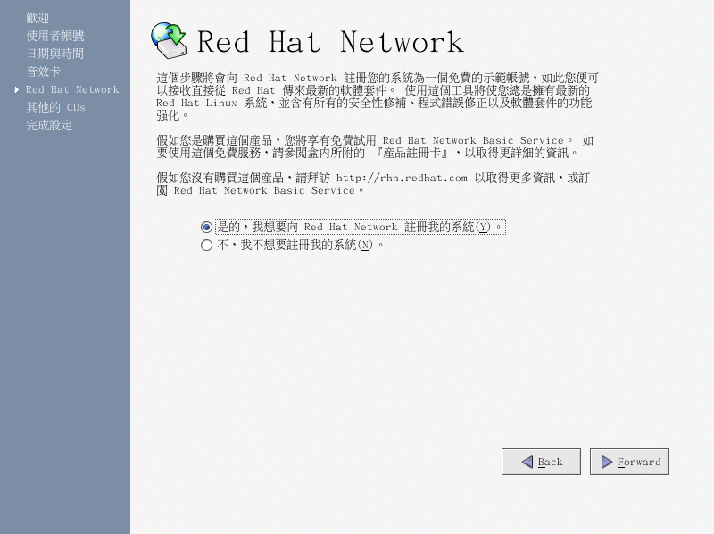 如果您想要向 Red Hat Network 註冊您的系統,並且接收您 Red Hat Linux 系統的自動更新,請選擇 『是的,我想要向 Red Hat Network 註冊我的系統』。 這將會啟動 Red Hat 更新代理程式 — 一個用來一步一步引導您向 Red Hat Network 註冊您機器的工具。 如要跳過註冊程序,請選擇 『不,我不想要註冊我的系統』。 如需更多關於 Red Hat Network 與註冊您機器的資訊,請參考 Red Hat Network 的說明文件在 http://www.redhat.com/docs/manuals/RHNetwork/。