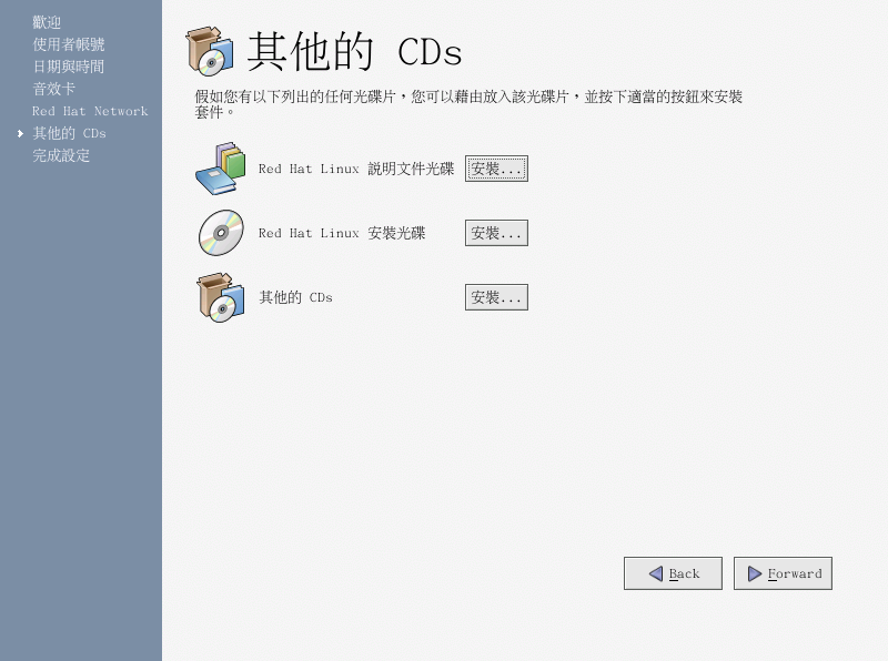如要安裝在安裝過程中未安裝的 Red Hat Linux RPM 套件或由其他協力廠商提供的軟體,或是在 Red Hat Linux 說明文件 CD 上的說明文件,您可以在 『其他的 CDs』 畫面中安裝它們。 請放入含有您想要安裝之軟體或說明文件的 CD,再點選 安裝... 的按鈕,然後依照指示進行安裝。