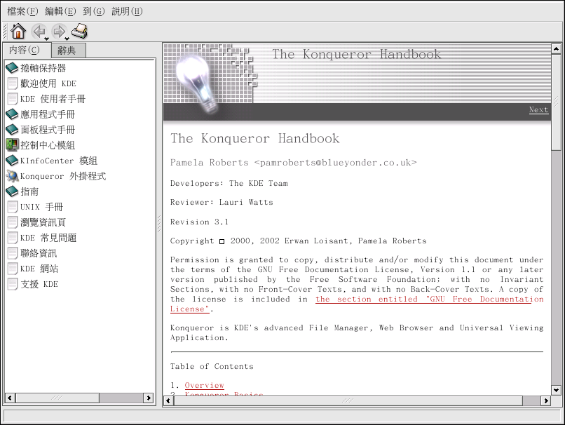 如需關於使用 Konqueror 的更多資訊,請點選 『說明』 (在頂端的選單面板上),然後再選取 『Konqueror 征服家手冊』。