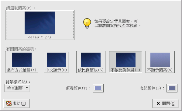 您可以使用新的顏色或一個新的圖案來設定您的桌面背景,如要了解關於設定桌面背景圖案的更多資訊,請參考 菴 2.4.1.1 節。