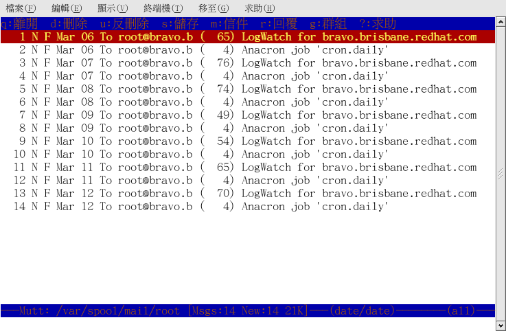 這些訊息是在預設的郵件資料夾,通常稱為 mailspool, 您可以將它當作您的收件夾。 使用鍵盤上的
