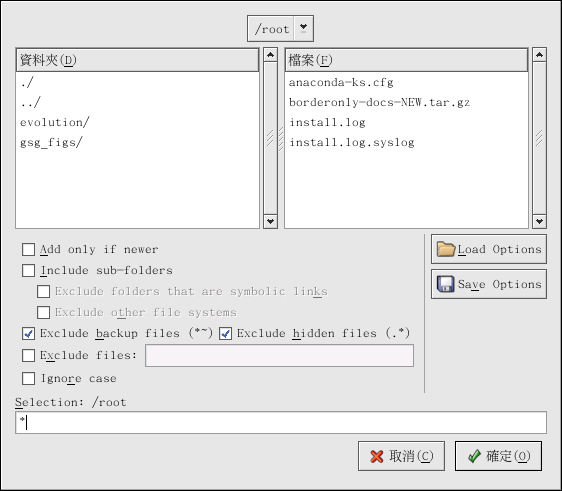 假如您要釋放一些硬碟空間,或要透過電子郵件傳送許多檔案或一整個目錄的檔案到另一個使用者。 File Roller 使您可以建立您檔案與目錄的歸檔。 如要建立一個新的歸檔,請點選工具列上的 新增 按鈕。 將會跳出一個檔案瀏覽器,讓您指定一個歸檔的名稱以及壓縮的技術。 例如您可以從下拉式的選單中選擇一個 『使用 gzip 的 tar 壓縮 (tar.gz)』 格式,然後再輸入您想要建立之歸檔檔案的檔名。 點選 確定 後,這個新的歸檔檔案就可以開始放入檔案與目錄了,如要增加檔案到這個新的歸檔檔案,請點選 新增 按鈕,然後將會跳出一個瀏覽視窗 (圖形 14-2),在這裡您可以瀏覽以找出您想要放入歸檔的檔案或目錄。 當您完成後,請點選 確定,並且按下 關閉 來關閉這個歸檔。