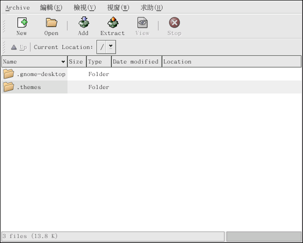 如要啟動 File Roller ,請選擇 『主選單』 => 『輔助程式』 => File Roller。 您也可以從 shell 提示符號下輸入 file-roller 指令來啟動 File Roller。 圖形 14-1 顯示出使用中的 File Roller。