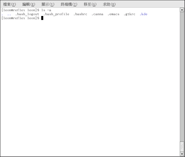 -a — 所有的(all)。 列出目錄中的所有檔案,包括隱藏檔 (.filename)。 在輸出清單頂端的這個 .. 與 . 分別代表母目錄與目前的目錄。