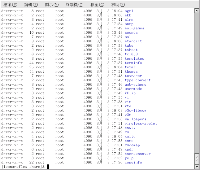 當您想要使用 ls 指令來檢視目錄的內容時,您並不需要在您想檢視的目錄中。 例如,想從您的家目錄來看 /usr/share/ 目錄中的內容,請輸入: