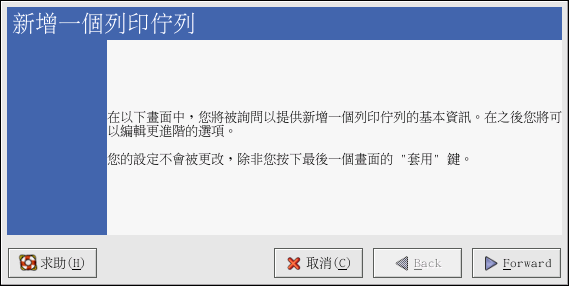 如要新增一部本機印表機,例如經由並列埠或 USB 埠連接至您電腦的印表機,請點選 印表機設定工具 主要視窗中的 新增 按鈕以顯示如 圖形 8-1 的視窗,再點選 下一步 以繼續。