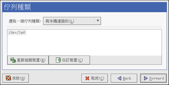 在點選 下一步 之後,會出現 圖形 8-3。 請從 『選取一個佇列種類』 的選單中選擇 『與本機連接的』,並選取一個裝置。 這裡的裝置通常是以 /dev/lp0 代表並列埠的印表機或 /dev/usb/lp0 代表 USB 的印表機。 假如清單上沒有出現任何裝置,請點選 重新偵測裝置來重新偵測您的電腦或點選 自訂裝置 來手動地指定它。 最後再點選 下一步 以繼續。