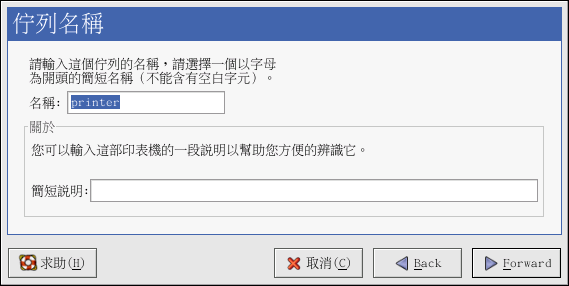 在如 圖形 8-2 所示的視窗中,為印表機輸入一個獨特的名稱到 『名稱』 的文字欄位。 印表機名稱不能含有空白且必須以字母開頭,名稱中可以包含字母、數字、引號(-)以及底線(_)。 您還可以為印表機輸入一個簡短的描述,其中可含有空白。
