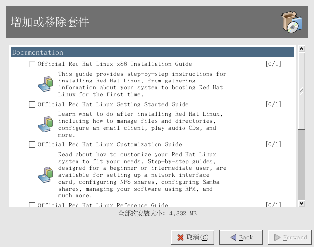 假如您有 Red Hat Linux 盒裝版,請記得瀏覽一下 Red Hat Linux 說明文件光碟。 所有 Red Hat Linux 的手冊都在這片光碟上。 您也可以在 http://www.redhat.com/docs/ 下載個別的手冊,有 HTML、RPM、PDF 以及壓縮的 tarball 格式 (.tar.gz)。 當您登入您的使用者帳號,放入說明文件光碟到光碟機中應該會啟動 套件管理工具,並讓您可以安裝任何 Red Hat Linux 的說明文件。 請遵照指示並選擇您想要安裝的說明文件。