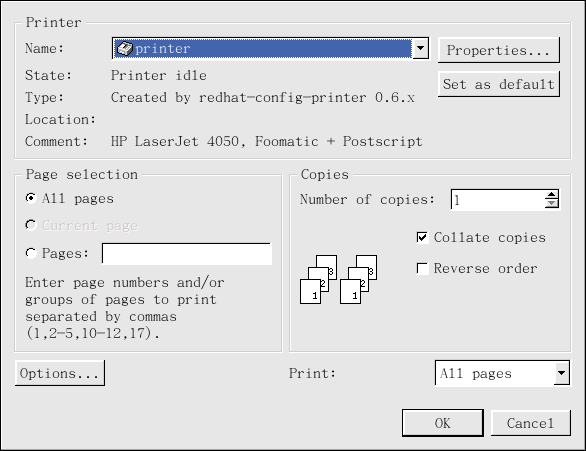 您也可以直接從一個 shell 提示符號列印一個檔案,舉例來說,lpr sample.txt 指令將會列印出 sample.txt 文字檔案。 列印過濾器會決定該檔案的類型,並將它轉換至印表機所能辨識的格式。