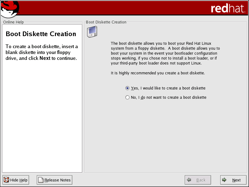 It is highly recommended that you create a boot diskette. If, for some reason, your system were not able to boot properly using GRUB, LILO, or a third-party boot loader, a boot diskette would enable you to properly boot your Red Hat Linux system.