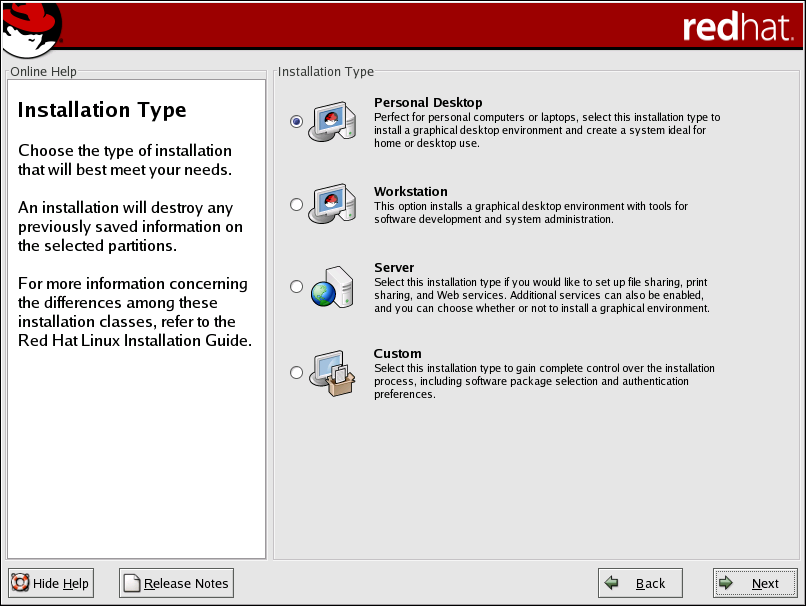 Choose the type of installation you would like to perform (see Figure 3-11). Red Hat Linux allows you to choose the installation type that best fits your needs. Your options are Personal Desktop, Workstation, Server, Custom, and Upgrade.