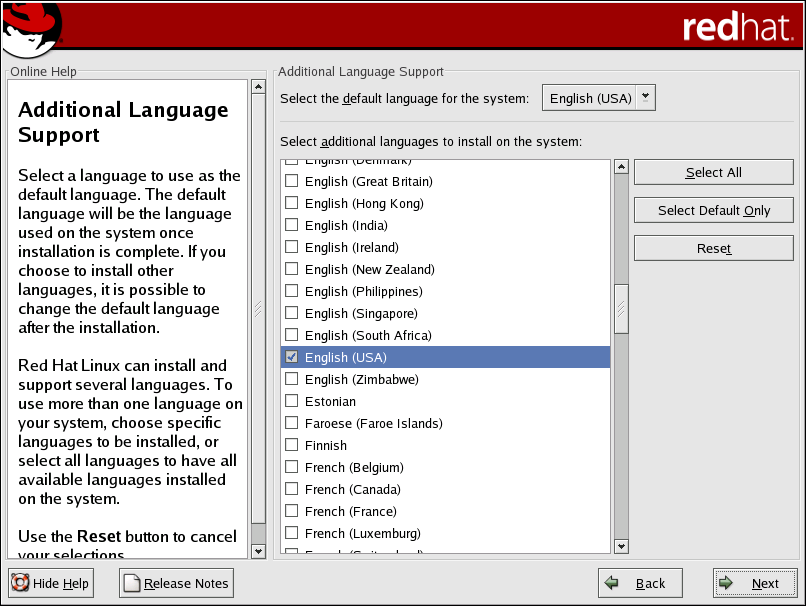 To use more than one language on your system, choose specific languages to be installed or select all languages to have all available languages installed on your Red Hat Linux system.