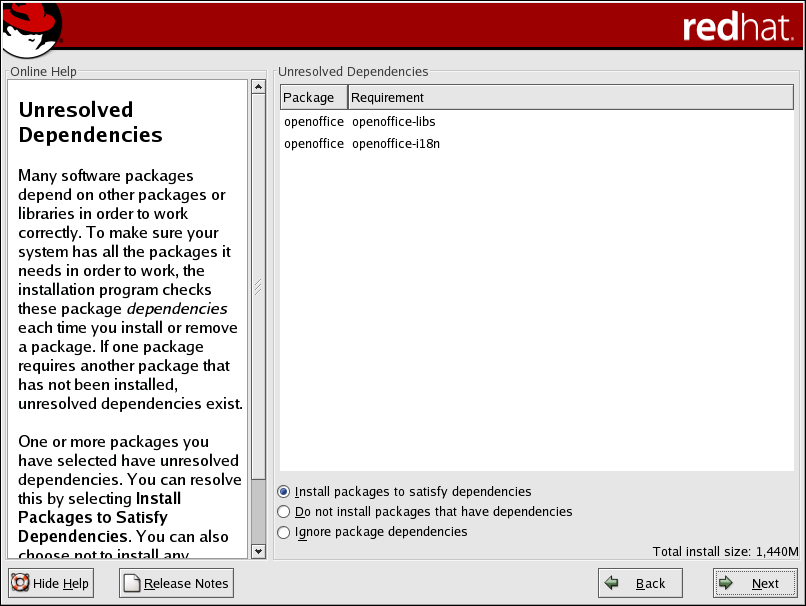 The Unresolved Dependencies screen appears only if you are missing packages that are needed by the packages you have selected. At the bottom of the screen, under the list of missing packages, an Install packages to satisfy dependencies checkbox is selected by default. If you leave this checked, the installation program will resolve dependencies automatically by adding all required packages to the list of selected packages.