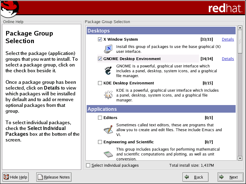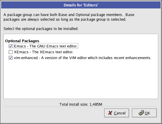 You can select package groups, which group components together according to function (for example, X Window System and Editors), individual packages, or a combination of the two.