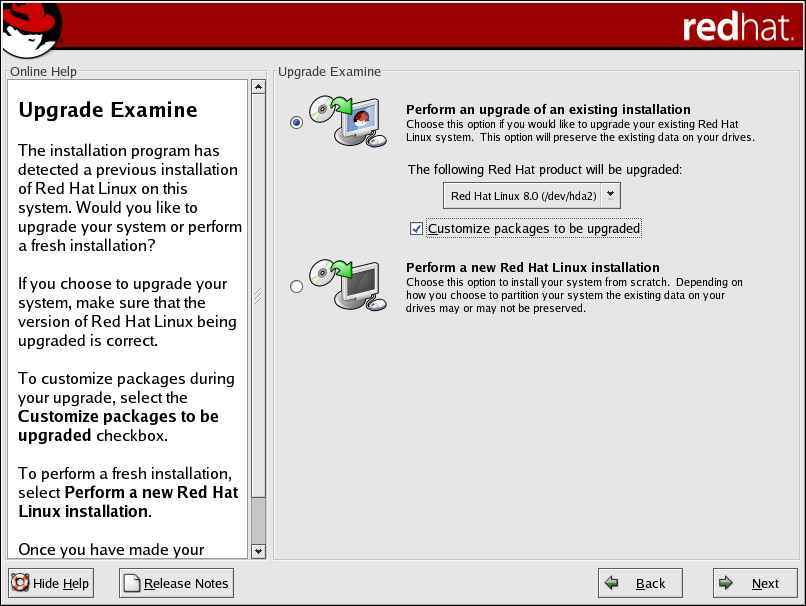 The Upgrade Examine screen appears automatically if the installation program detects a prior version of Red Hat Linux on your system.