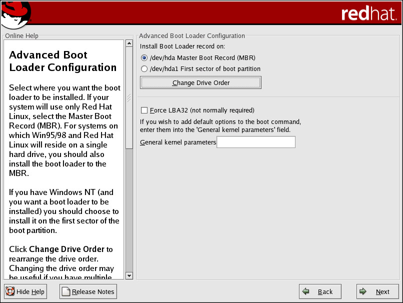 The Force LBA32 (not normally required) option allows you to exceed the 1024 cylinder limit for the /boot partition. If you have a system which supports the LBA32 extension for booting operating systems above the 1024 cylinder limit, and you want to place your /boot partition above cylinder 1024, you should select this option.