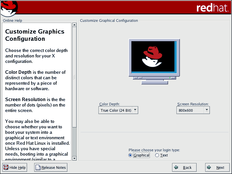 If you are performing a custom or server installation, you can also choose whether you want to boot your system into a graphical or text environment once the installation is complete. Unless you have special needs, booting into a graphical environment (similar to a Windows environment) is recommended. If you choose to boot into a text environment, you will be presented with a command prompt (similar to a DOS environment).
