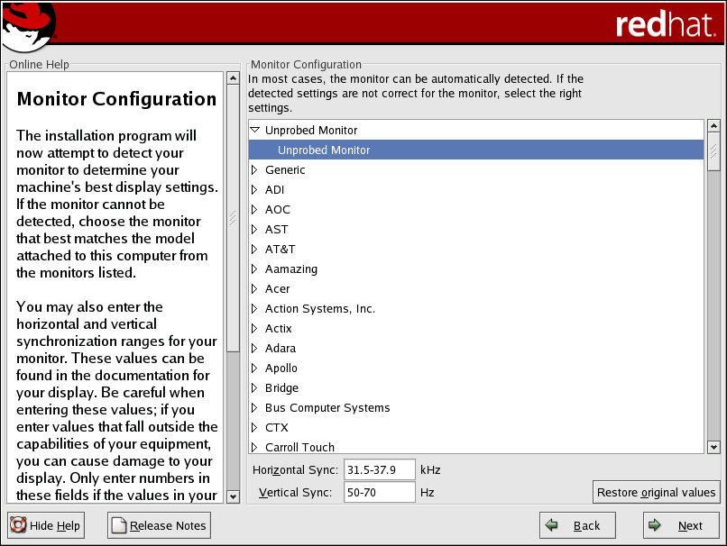 If your monitor does not appear on the list, select the most appropriate Generic model available. If you select a Generic monitor, the installation program will suggest horizontal and vertical sync ranges. These values are generally available in the documentation which accompanies your monitor, or from your monitor's vendor or manufacturer; please check your documentation to make sure these values are set correctly.