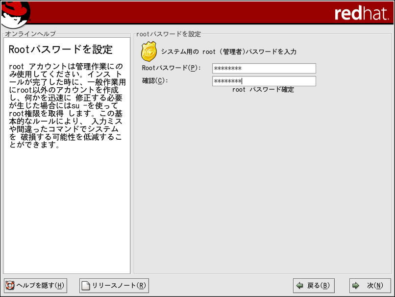 ¥¤¥ó¥¹¥È¡¼¥ë´°Î»¸å¤Ëroot¤Î ¥Ñ¥¹¥ï¡¼¥É¤òÊѹ¹¤¹¤ë¤Ë¤Ï¡¢Root ¥Ñ¥¹¥ï¡¼¥É¥Ä¡¼¥ë ¤ò»ÈÍѤ·¤Þ¤¹¡£ ¥·¥§¥ë¥×¥í¥ó¥×¥È¤Çredhat-config-rootpassword ¥³¥Þ¥ó¥É¤òÆþÎϤ·¤ÆRoot ¥Ñ¥¹¥ï¡¼¥É¥Ä¡¼¥ë ¤òµ¯Æ°¤·¤Þ¤¹¡£root¤Ç¤Ê¤¤¾ì¹ç¡¢Â³¹Ô¤¹¤ë¤¿¤á root¥Ñ¥¹¥ï¡¼¥É¤ÎÆþÎϤ¬Í׵ᤵ¤ì¤Þ¤¹¡£ |
