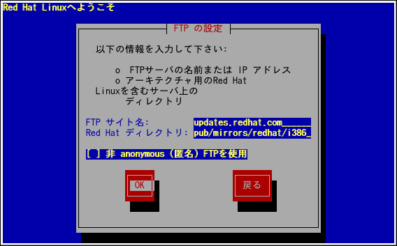 ¥¤¥ó¥¹¥È¡¼¥ë¤·¤è¤¦¤È¤·¤Æ¤¤¤ëFTP ¥µ¥¤¥È¤Î ̾Á°¤Þ¤¿¤ÏIP¥¢¥É¥ì¥¹¤È¡¢¥¢¡¼¥¥Æ¥¯¥Á¥ãÍÑ ¤ÎRedHat ¥¤¥ó¥¹¥È¡¼¥ë¥Õ¥¡¥¤¥ë¤ò´Þ¤ó¤Ç¤¤¤ë¥Ç¥£¥ì¥¯¥È¥ê ¤Î̾Á°¤òÆþÎϤ·¤Þ¤¹¡£Î㤨¤Ð¡¢ FTP¥µ¥¤¥È¤¬ /mirrors/redhat/i386/RedHat ¥Ç¥£¥ì¥¯¥È¥ê¤ò´Þ¤ó¤Ç¤¤¤ë¾ì¹ç¡¢ /mirrors/redhat/i386¤ÈÆþÎϤ·¤Þ¤¹¡£ ¤¹¤Ù¤Æ¤¬Àµ¤·¤¯»ØÄꤵ¤ì¤Æ¤¤¤ë¤È¡¢base/hdlist ¤¬ÆÉ¤ß¹þ¤ßÃæ¤Ç¤¢¤ë¤³¤È¤ò¼¨¤¹¥á¥Ã¥»¡¼¥¸ ¥Ü¥Ã¥¯¥¹¤¬É½¼¨¤µ¤ì¤Þ¤¹¡£