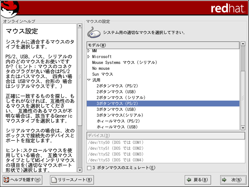 ¥¤¥ó¥¹¥È¡¼¥ë¤¬´°Î»¤·¤¿¸å¤Ç¡¢¥Þ¥¦¥¹¤ÎÀßÄê ¤òÊѹ¹¤¹¤ë¤Ë¤Ï¡¢¥Þ¥¦¥¹ÀßÄê¥Ä¡¼¥ë¤ò»ÈÍѤ·¤Þ¤¹¡£ ¥·¥§¥ë¥×¥í¥ó¥×¥È¤Çredhat-config-mouse ¤òÆþÎϤ·¤Æ¡¢¥Þ¥¦¥¹ÀßÄê¥Ä¡¼¥ë¤òµ¯Æ°¤·¤Þ¤¹¡£ root°Ê³°¤ÇÁàºî¤·¤Æ¤¤¤ë¾ì¹ç¡¢Â³¹Ô¤¹¤ë¤¿¤á¤Ëroot¥Ñ¥¹¥ï¡¼¥É¤¬Í×µá ¤µ¤ì¤Þ¤¹¡£ ¥Þ¥¦¥¹¤òº¸Íø¤ÍѤËÀßÄꤹ¤ë¤Ë¤Ï¡¢¥Þ¥¦¥¹¥Ü¥¿¥ó¤Î½ç½ø¤ò¥ê¥»¥Ã¥È ¤·¤Þ¤¹¡£¤³¤ì¤ò¼Â¹Ô¤¹¤ë¤Ë¤Ï¡¢¥·¥¹¥Æ¥à¤òµ¯Æ°¤·¤¿¸å¤Ë¥·¥§¥ë¥×¥í¥ó¥×¥È ¤Çgpm -B 321¤ÈÆþÎϤ·¤Þ¤¹¡£ |