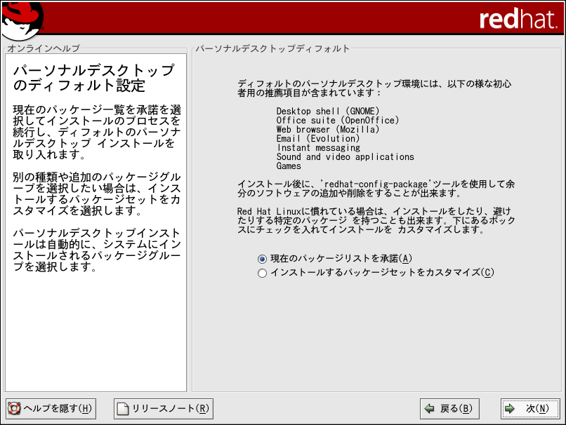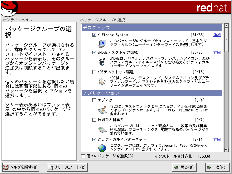 ¥¤¥ó¥¹¥È¡¼¥ë¤·¤¿¤¤³Æ¥³¥ó¥Ý¡¼¥Í¥ó¥È¤òÁªÂò¤·¤Æ¤¯¤À¤µ¤¤¡£ ¥«¥¹¥¿¥à¥¤¥ó¥¹¥È¡¼¥ë¤ÎÃæ¤Ç¤¹¤Ù¤Æ (¥³¥ó¥Ý¡¼¥Í¥ó¥È¥ê¥¹¥È¤ÎËöÈø)¤òÁªÂò¤¹¤ë¤ÈRed Hat Linux¤Ë´Þ¤Þ¤ì¤ë¤¹¤Ù¤Æ¤Î ¥Ñ¥Ã¥±¡¼¥¸¤ò¥¤¥ó¥¹¥È¡¼¥ë¤·¤Þ¤¹¡£