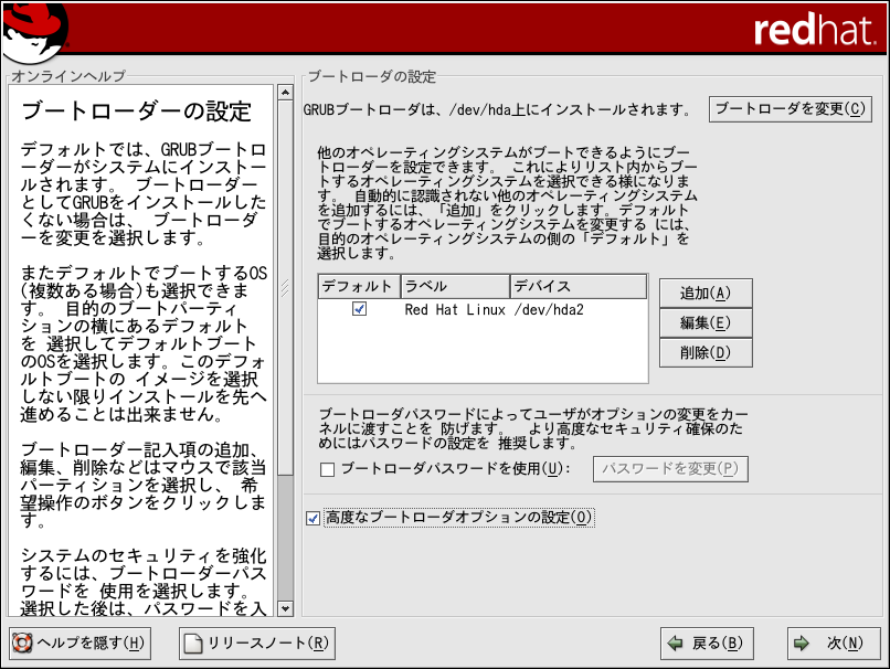 ¥·¥¹¥Æ¥à¤Ë¤¹¤Ç¤Ë¾¤Î¥Ö¡¼¥È¥í¡¼¥À¡¼¤¬¤¢¤ë¾ì¹ç¤Ë¤Ï¡¢¤³¤ÎÀßÄê¤ò ¿äÁ¦¤·¤Þ¤¹¡£¤³¤Î¾ì¹ç¡¢¸½Â¸¤Î¥Ö¡¼¥È¥í¡¼¥À¡¼¤¬Àè¤Ë¥³¥ó¥È¥í¡¼¥ë¤·¤Þ¤¹¡£ ¤½¤Î¥Ö¡¼¥È¥í¡¼¥À¡¼¤¬¤µ¤é¤ËRed Hat Linux¤òµ¯Æ°¤¹¤ë GRUB (¤Þ¤¿¤Ï LILO)¤ò ¥¹¥¿¡¼¥È¤µ¤»¤ë¤è¤¦ÀßÄꤹ¤ë¤³¤È¤¬¤Ç¤¤Þ¤¹¡£