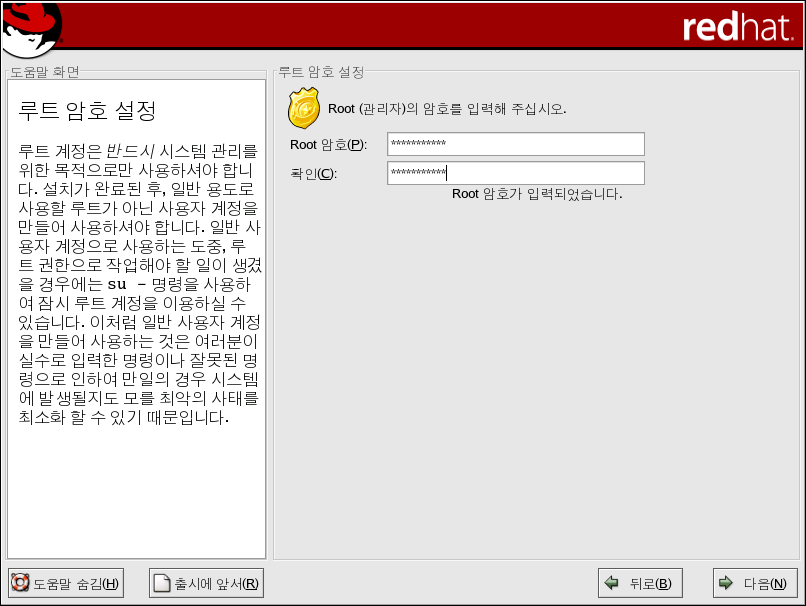 ·çÆ® °èÁ¤°ú ¾ÏÈ£¸¦ ¼³Á¤ÇÏ´Â °ÍÀº ¼³Ä¡¿¡ ÀÖ¾î¼ °¡Àå Áß¿äÇÑ °úÁ¤ÀÔ´Ï´Ù. ·çÆ® °èÁ¤Àº Windows NT¿¡¼ »ç¿ëµÇ´Â °ü¸®ÀÚ °èÁ¤°ú À¯»çÇÑ °³³äÀÔ´Ï´Ù. ·çÆ® °èÁ¤Àº ÆÐŰÁö ¼³Ä¡, RPM ¾÷±×·¹À̵å¿Í ´ëºÎºÐ ½Ã½ºÅÛ °ü¸®¸¦ ¼öÇàÇϴµ¥ »ç¿ëµË´Ï´Ù. ·çÆ®·Î ·Î±×ÀÎ ÇÏ°Ô µÇ¸é ½Ã½ºÅÛ¿¡ ´ëÇÑ ¿Ïº®ÇÑ Á¦¾î±ÇÀ» °®°Ô µË´Ï´Ù.