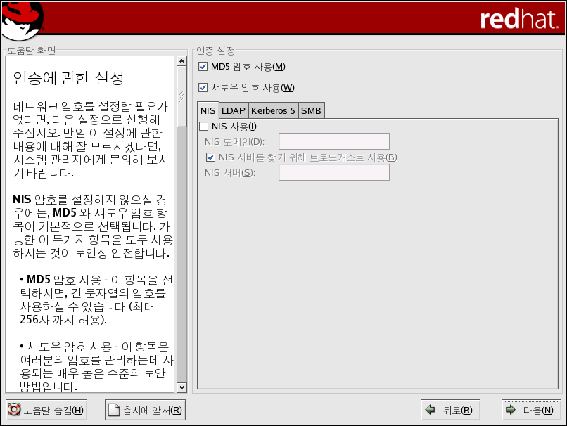 NIS ÀÎÁõÀ» ¼³Ä¡ÇÏÁö ¾Ê´Â ÇÑ, ¿ÀÁ÷ MD5 ¿Í ¼¨µµ¿ì (shadow) ¾ÏÈ£¸¸ ¼±ÅõǾî Áý´Ï´Ù. (±×¸² 3-24 ÂüÁ¶). µÎ ¾ÏÈ£ ¸ðµÎ ¼±ÅÃÇÏ¿© °¡´ÉÇÑ º¸¾È µî±ÞÀ» ³ôÀ̽ñ⠹ٶø´Ï´Ù.