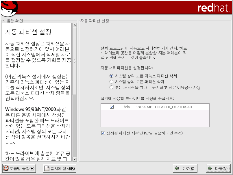 ¸¶¿ì½º¸¦ ÀÌ¿ëÇÏ¿©, Red Hat Linux°¡ ¼³Ä¡µÉ ÇÏµå µå¶óÀ̺긦 ¼±ÅÃÇÕ´Ï´Ù. ¸¸ÀÏ µÎ°³ ÀÌ»óÀÇ ÇÏµå µå¶óÀ̺갡 Á¸ÀçÇÑ´Ù¸é, ¾î´À ÇÏµå µå¶óÀ̺꿡 ¼³Ä¡ÇÒ °ÍÀÎÁö ¼±ÅÃÇÏ½Ç ¼ö ÀÖ½À´Ï´Ù. ¼±ÅõÇÁö ¾ÊÀº ÇÏµå µå¶óÀ̺ê¿Í ±× ÇÏµå µå¶óÀ̺êÀÇ µ¥ÀÌÅÍ¿¡´Â ¾Æ¹«·± ¿µÇâÀ» ¹ÌÄ¡Áö ¾Ê½À´Ï´Ù.