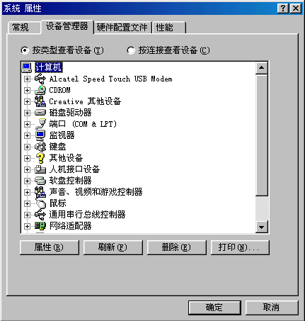 点击 「设备管理器」按钮。你就会看到你的电脑的硬件配置的图形化表示。请确定被选的是 「按类型查看设备」 单选按钮。