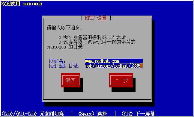 HTTP 对话框(图 3-6)只有在你从 HTTP 服务器中安装时才会出现( 如果你在「安装方法」中选择了「HTTP」的话)。该对话框提示你输入要从中安装 Red Hat Linux 的 HTTP 服务器的信息。