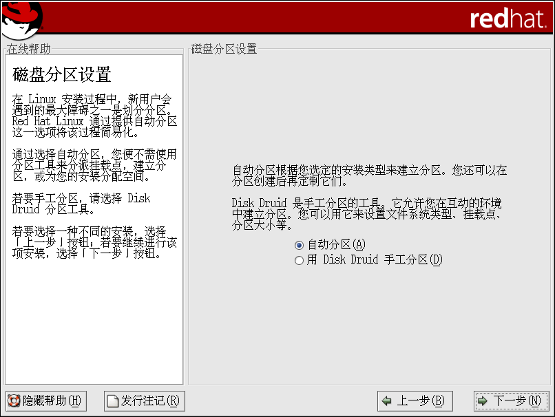 在这个屏幕上,你可以选择自动分区,或者使用 Disk Druid 来手工分区。