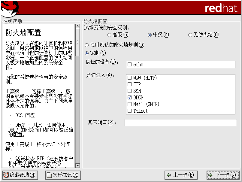 Red Hat Linux 为增加系统安全性提供了防火墙保护。防火墙存在于你的计算机和网络之间,用来判定网络中的远程用户有权访问你的计算机上的哪些资源。一个正确配置的防火墙可以极大地增加你的系统安全性。