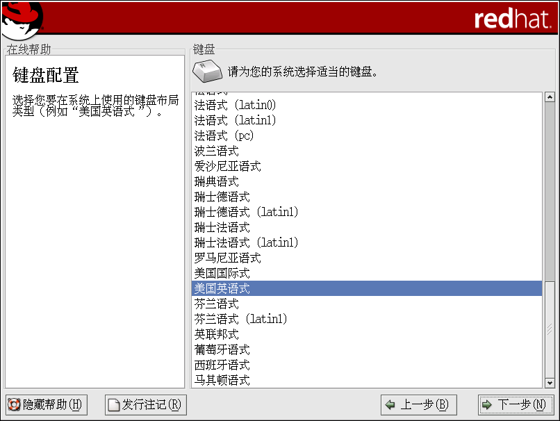 使用鼠标来选择你要在本次安装中和今后用作系统默认的键盘布局类型(例如,美国英语式),参见图 3-8。