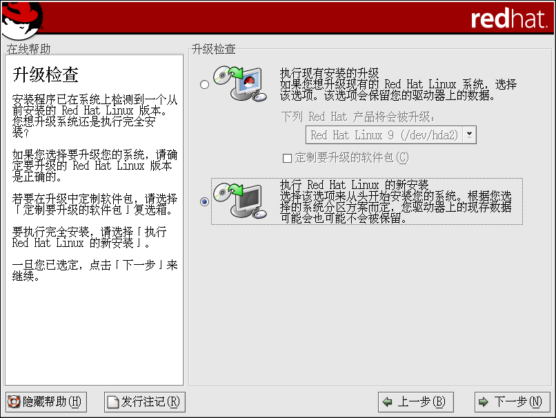 如果安装程序在你的系统上检测到从前安装的 Red Hat Linux 版本,「升级检查」屏幕就会自动出现。
