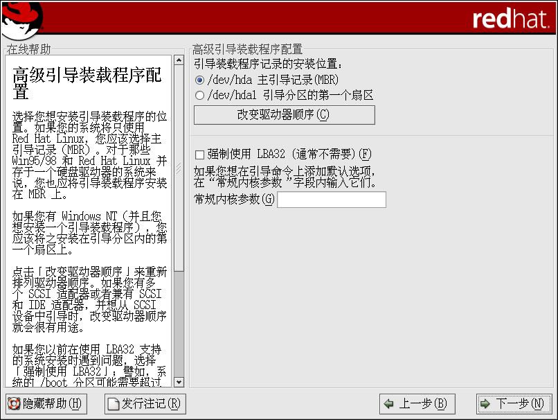 「强制使用 LBA32 (通常不需要)」选项允许你的 /boot 分区超过 1024 柱面限制。如果你的系统支持使用 LBA32 扩展来引导超过 1024 柱面限制的操作系统,并且你想把 /boot 分区放置在 1024 柱面之外,你应该选择该选项。