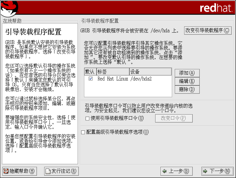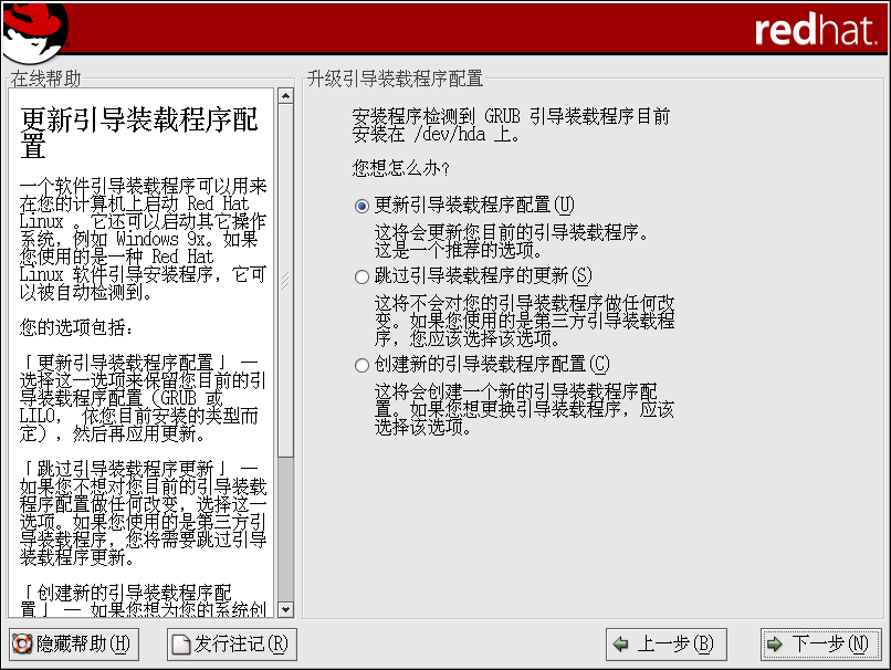 「创建新的引导装载程序配置」 — 如果你想为你的系统创建一个新的引导装载程序,选择这个选项。如果你目前装有 LILO 并想转换成 GRUB,或者如果你一直在使用引导盘来引导你的 Red Hat Linux 系统,但想使用一个引导装载程序软件如 GRUB 或 LILO,你将需要创建一个新的引导装载程序配置(详情请参阅 第 A.4.1 节)。