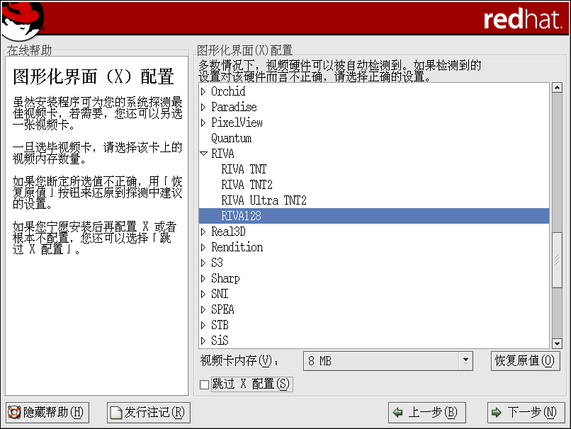 如果你决定要安装 X 窗口系统软件包,你现在就有机会为你的系统配置一个 X 服务器。如果你没有选择要安装 X 窗口系统软件包,请跳到第 3.28 节。