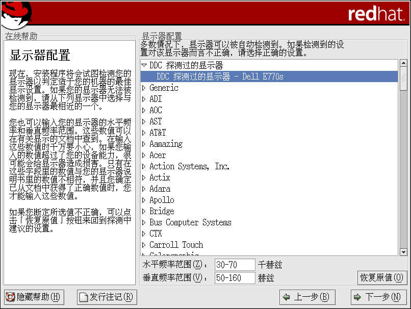 如果你的显示器没有在列表中出现,选择最恰当的「通用」 型号。若选择「通用」显示器,安装程序会建议一个水平和垂直频率范围。这些数值通常在你的显示器文档中可以找到,也可从你的显示器的销售商或制作商处得到。请核对你的文档以确保这些数值被正确设置了。