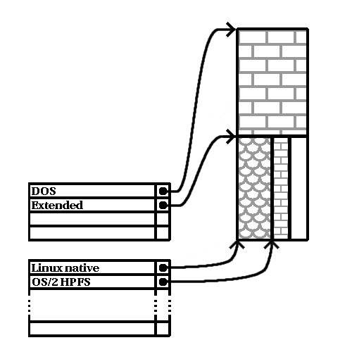如這個圖像所示,在主要分割區與邏輯分割區間有不相同之處 — 只能有四個主要分割區,但對於存在的邏輯分割區數量來說,並沒有一定的限制。 (然而,事實上,在單一的磁碟上定義超過 12 個邏輯分割區並不是一個好主意。)