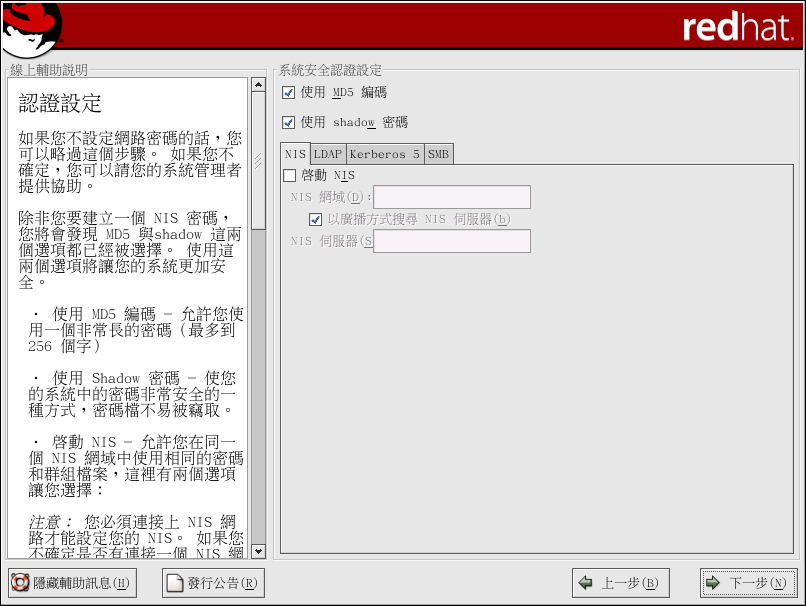 啟用 Kerberos — Kerberos 是一種提供網路認證服務的安全系統。 如需關於 Kerberos 的更多資訊,請參考在 Red Hat Linux 參考手冊 中的 Kerberos 章節。 這裡有三個選項供您選擇: